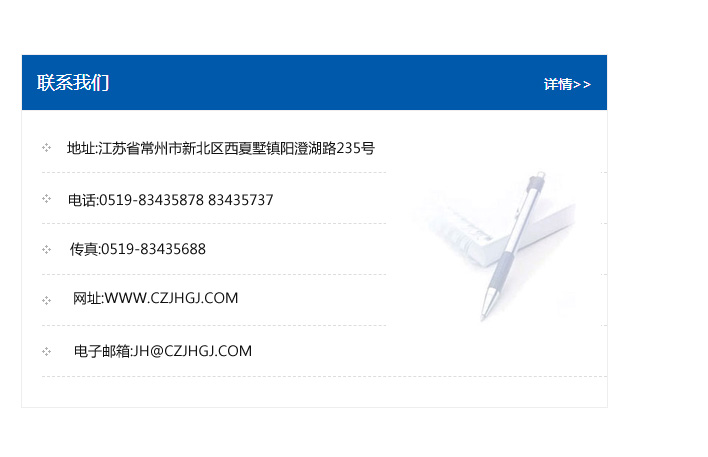 傳真:0519-83435688    郵編:213135    網址:WWW.czjhgj_com.cqqxjz.com    電子郵箱:JH@czjhgj_com.cqqxjz.com